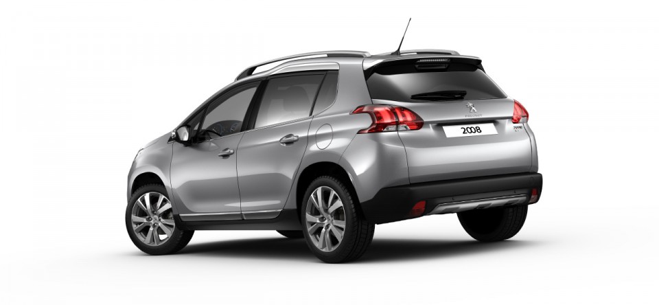 Photo 3D de 3/4 arrière de la Peugeot 2008 Gris Artense, le crossover compact urbain by Peugeot conçu sur la base de la Peugeot 208 : un petit véhicule combinant agilité, compacité, polyvalence et style affirmé...