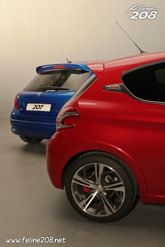 Photo de notre comparatif statique entre la Peugeot 208 GTi (1.6 THP 200, Rouge Rubi, 2013) et la Peugeot 207 RC (1.6 THP 175, Bleu Récife, 2007) !
