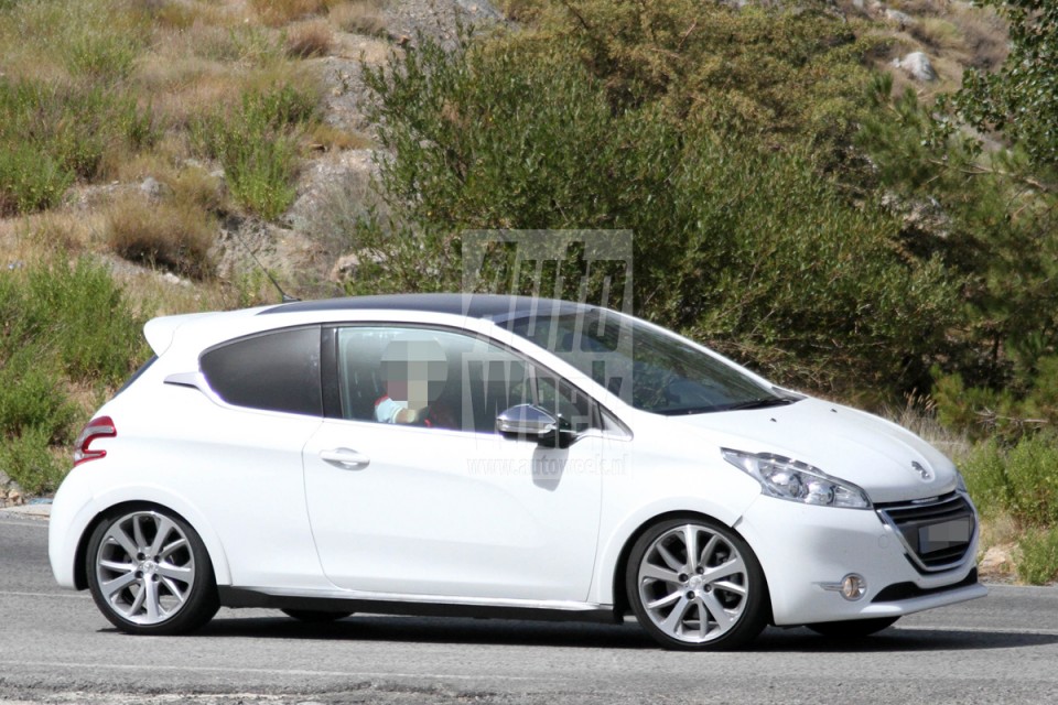 Photo espion d'un mulet de la Peugeot 208 GTi blanche, équipée d'un becquet, d'extensions d'ailes et de bas de caisse spécifiques