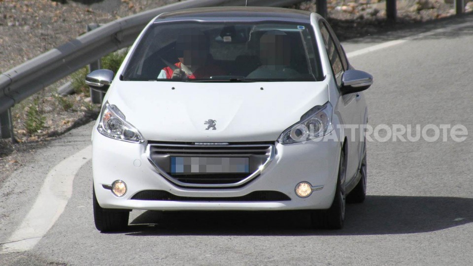 Photo espion d'un mulet de la Peugeot 208 GTi blanche en Espagne, équipée d'un becquet, d'extensions d'ailes et de bas de caisse spécifiques